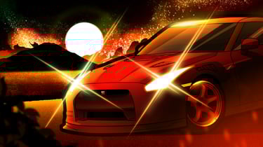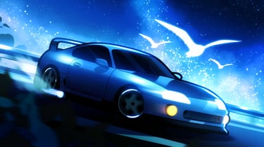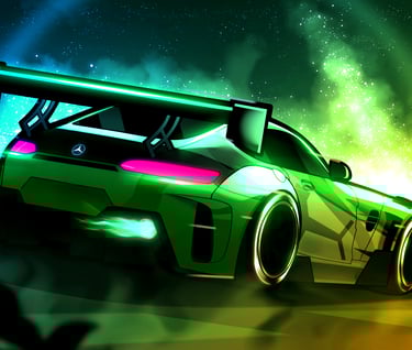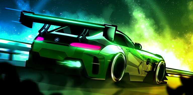 Night Mode moves away from neutral darkness and instead builds environments entirely around color. Each scene is driven by a dominant tone—often influenced by the car itself—transforming the surrounding world into a reflection of its presence.